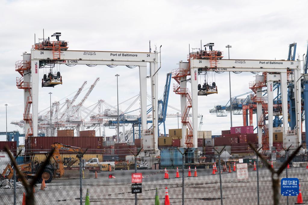 这是10月26日在美国马里兰州巴尔的摩市港口拍摄的货运集装箱和起重机。