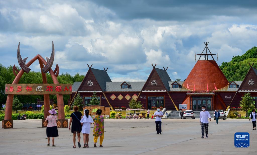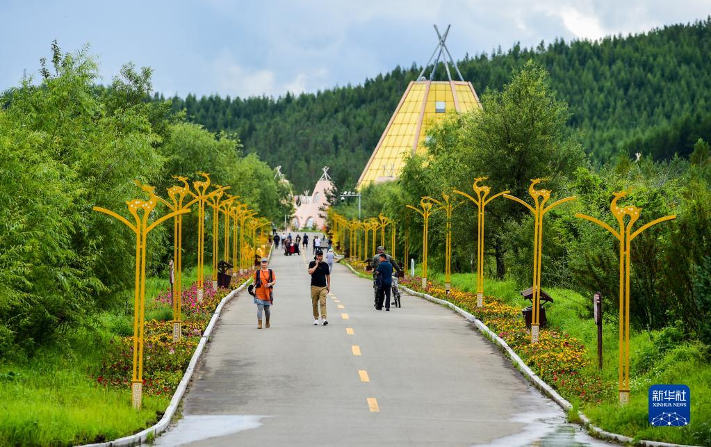 8月6日,在鄂伦春自治旗大杨树镇多布库尔猎民村,游人们在景区观光。 新华社记者 连振 摄
