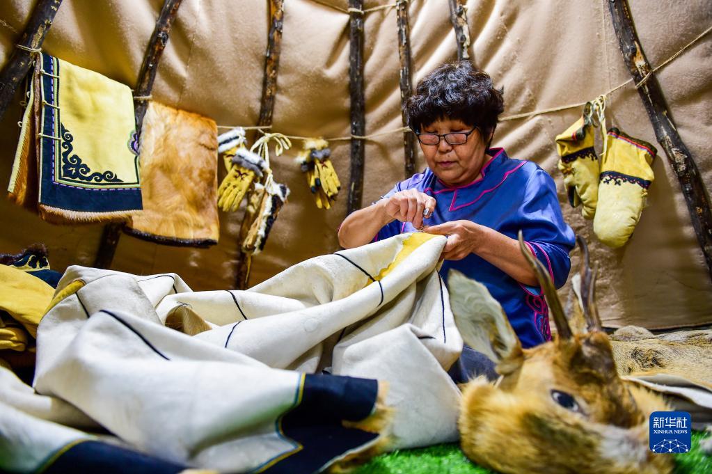 8月4日,在鄂伦春自治旗阿里河镇,吴玲芝在缝制一件兽皮衣,她是鄂伦春狍角帽制作技艺内蒙古自治区级非遗传承人。 新华社记者 连振 摄 |