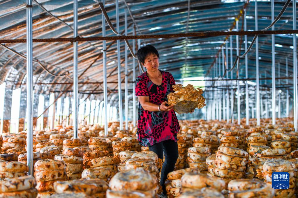 8月5日,在鄂伦春自治旗齐奇岭村,村民李金英在大棚里查看蘑菇生长情况。 新华社记者 刘磊 摄