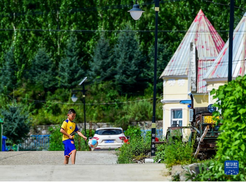 8月6日,在鄂伦春自治旗大杨树镇多布库尔猎民村,一名男孩在村里踢足球。 新华社记者 连振 摄