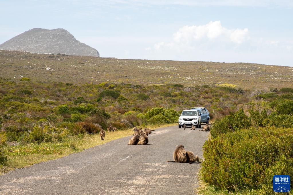 10月27日,在南非开普敦桌山国家公园的好望角区域,游客停车等候狒狒。