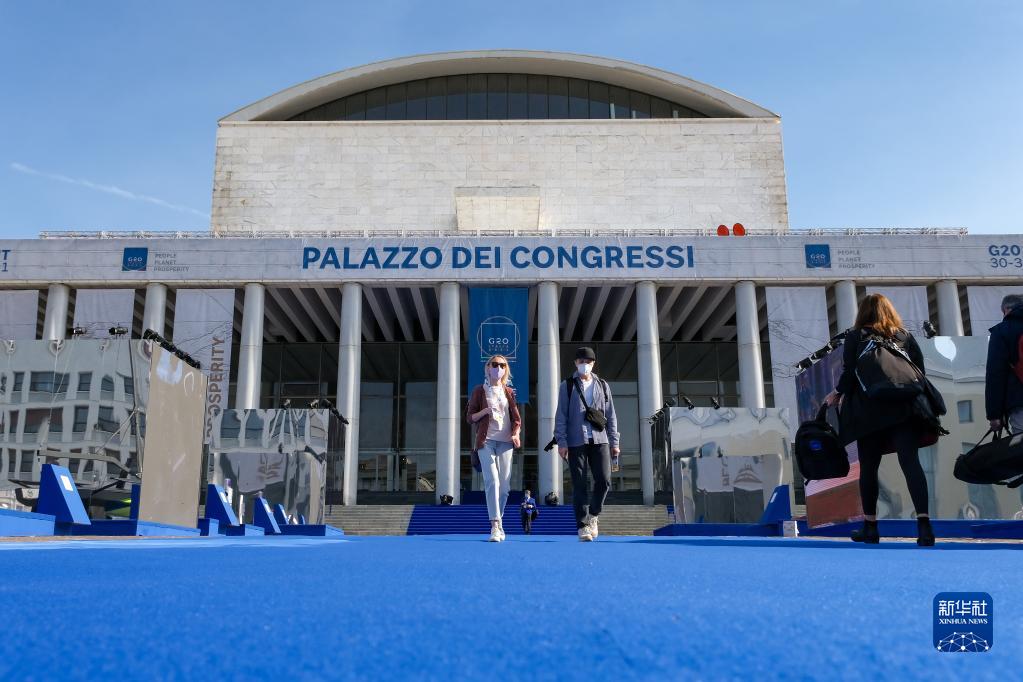10月28日,在意大利罗马,人们走在二十国集团领导人峰会媒体中心。