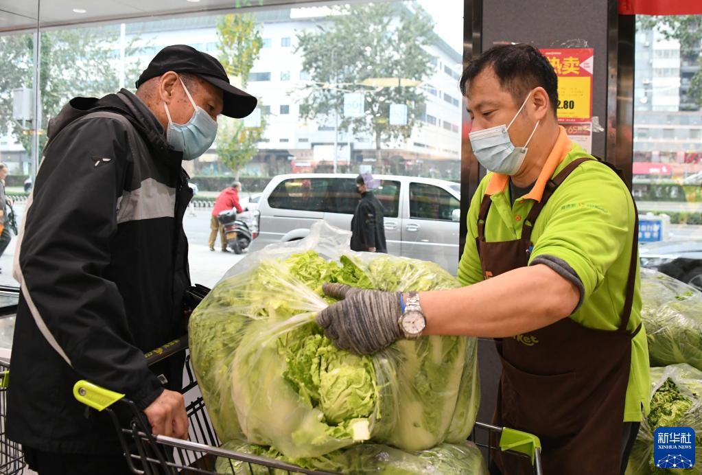 11月2日,在超市发科学城店,市民(右)选购冬储菜。 当日,北京超市发连锁各直营店冬储菜上市。据了解,冬储菜采用产地直采的方式供应市场。在销售冬储菜期间,北京超市发连锁50家直营店每天将提供150余吨大白菜、30余吨大葱。冬储菜供应将持续至11月4日。 新华社记者 任超 摄