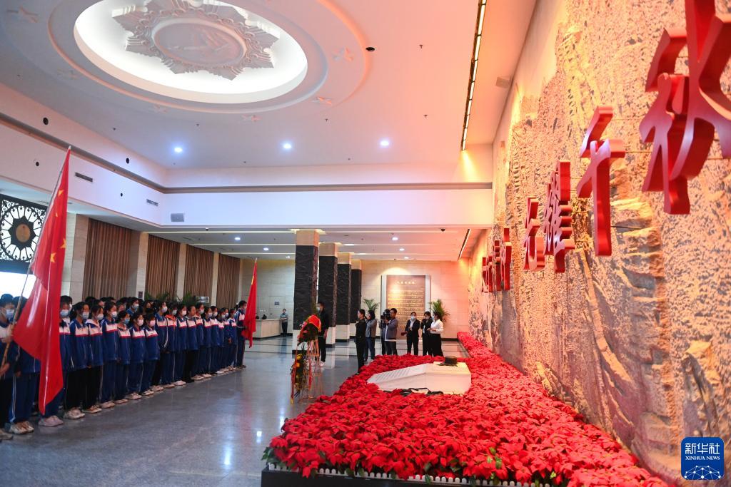 2021年9月18日,中学生在位于山西省长治市武乡县的八路军太行纪念馆聆听讲解。 新华社记者 柴婷 摄
