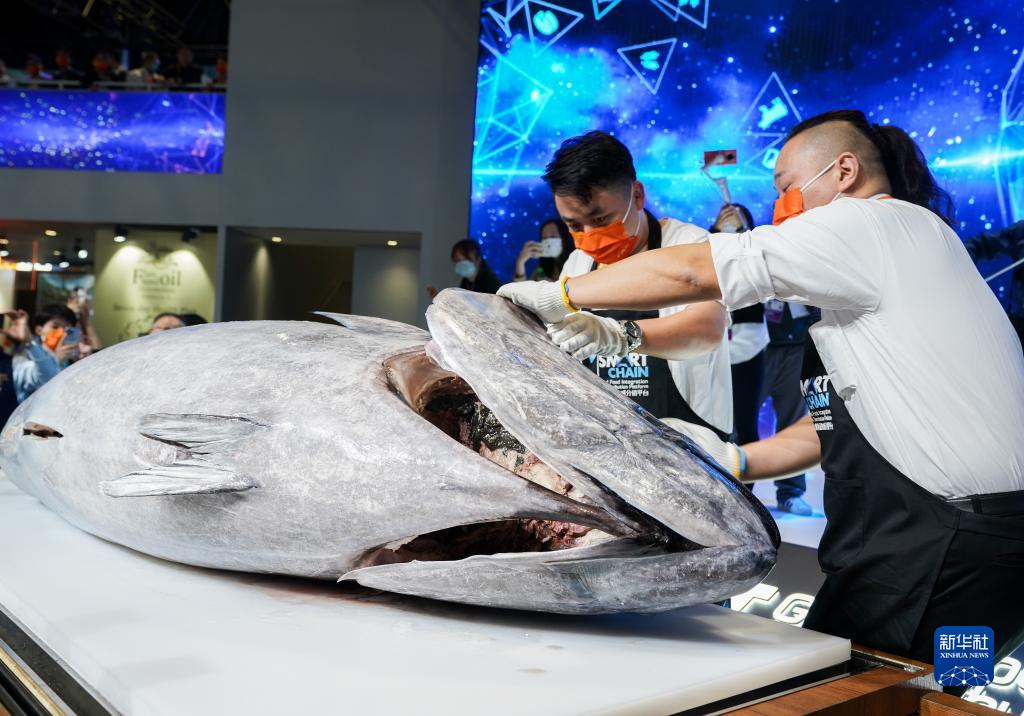 当日,一条体长近3米、重达353公斤的“金枪鱼王”亮相第四届进博会食品及农产品展区。据悉,这条在地中海海域生长的蓝鳍金枪鱼由光明食品集团旗下上海水产集团采购,经冷链运输于10月31日运抵上海。