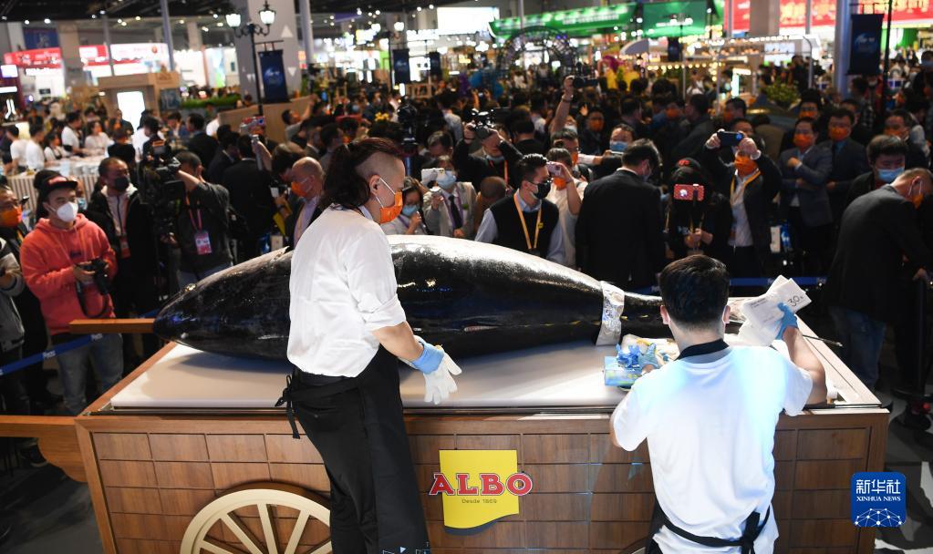 11月6日,工作人员在第四届进博会食品及农产品展区现场开鱼。