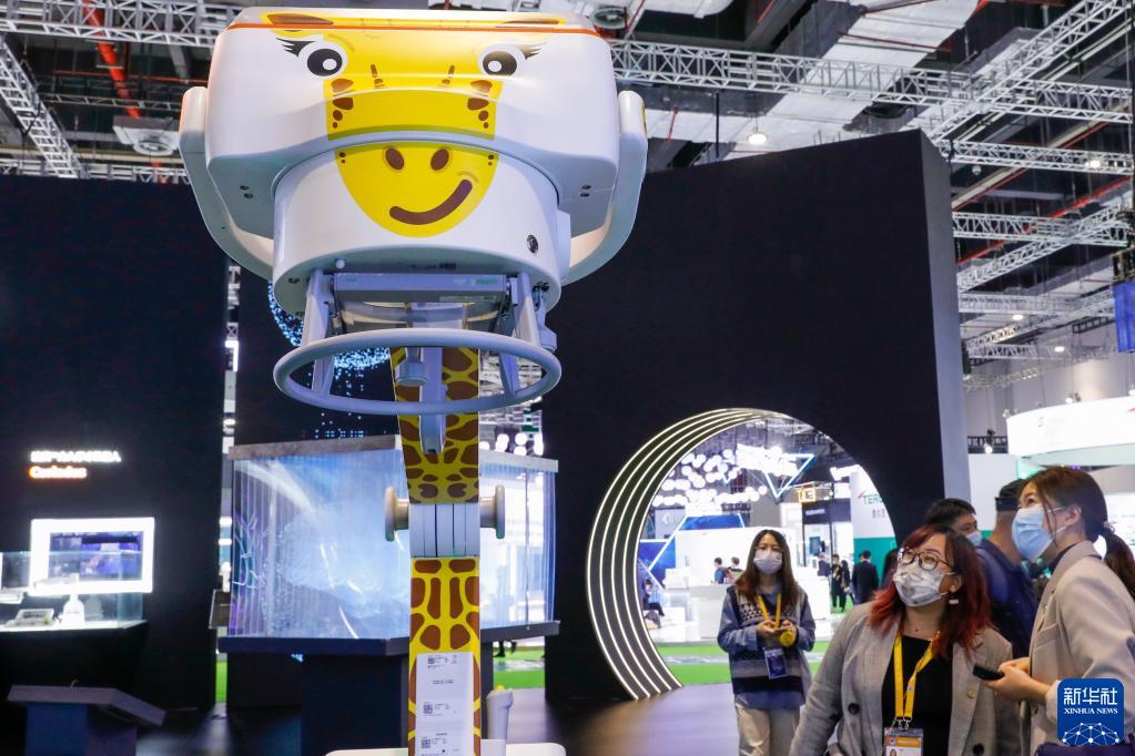11月6日,参观者在公共卫生防疫专区的西门子医疗展台观看一台移动式摄影x射线机。