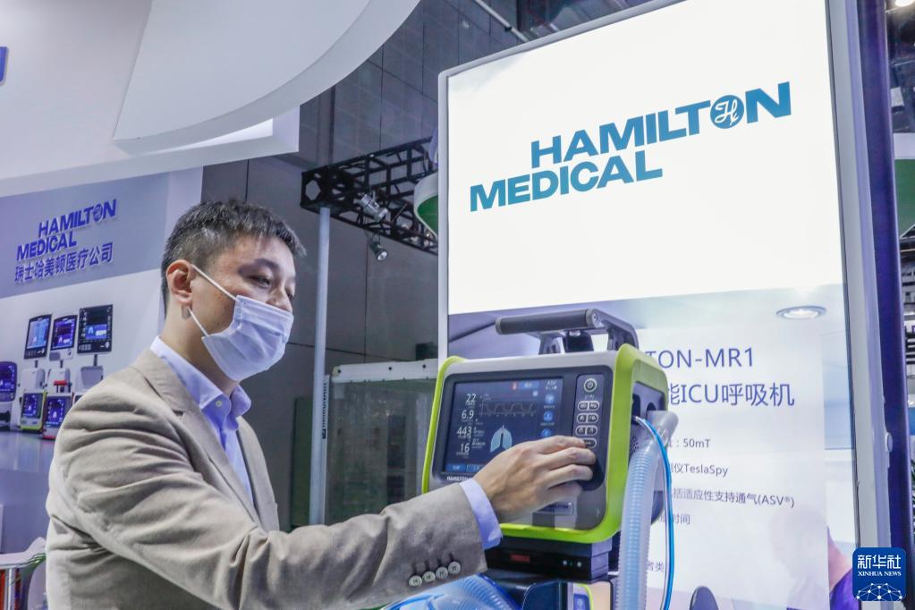 11月6日,工作人员在公共卫生防疫专区的瑞士哈美顿展台介绍一款可以配合核磁共振使用的呼吸机。