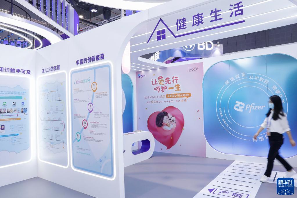 11月6日,工作人员走过公共卫生防疫专区的辉瑞疫苗展台。
