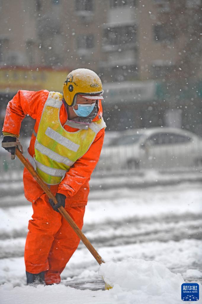 11月7日,环卫工人在天津市南开区街头除雪。