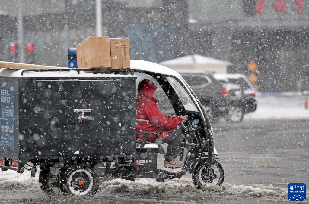 11月7日,在天津市南开区红旗南路,一名快递员骑车经过。