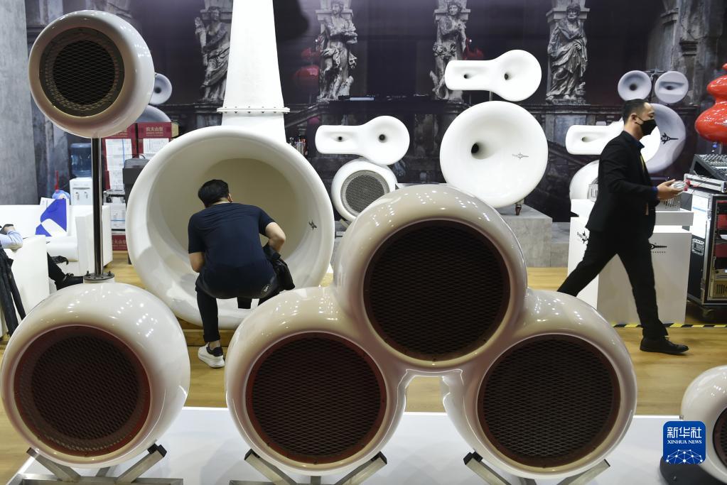11月6日,参会者在第四届进博会展馆里的意大利PEQUOD公司展位参观音响设备。PEQUOD公司首次参展进博会。 新华社记者 鲁鹏 摄