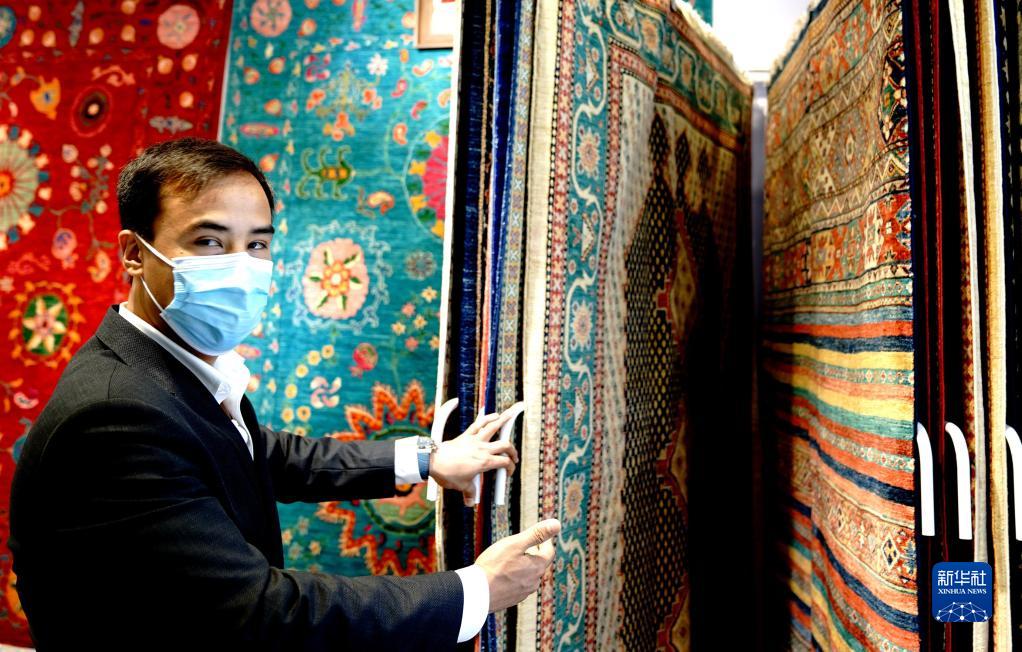 11月6日,阿富汗参展商阿里·法伊兹在第四届进博会推介阿富汗手工羊毛地毯。 新华社记者 张建松 摄