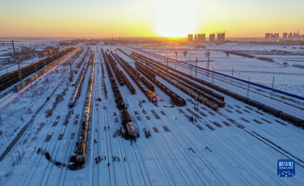 11月11日,在中铁沈阳局集团有限公司通辽站南编组场,武警官兵和铁路工作人员清理积雪(无人机照片)。