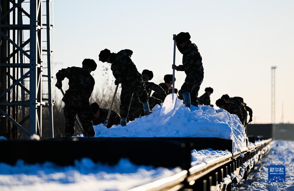11月11日,在中铁沈阳局集团有限公司通辽站南编组场,武警官兵在清理积雪。