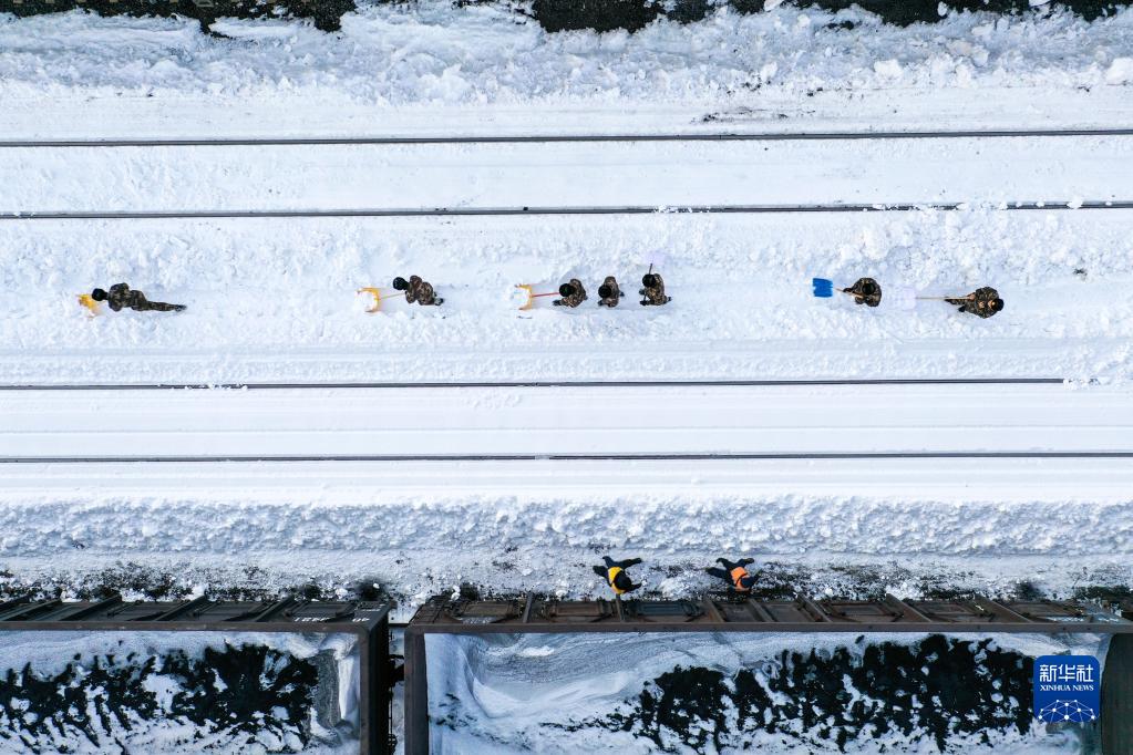 11月11日,在中铁沈阳局集团有限公司通辽站南编组场,武警官兵清理积雪(无人机照片)。