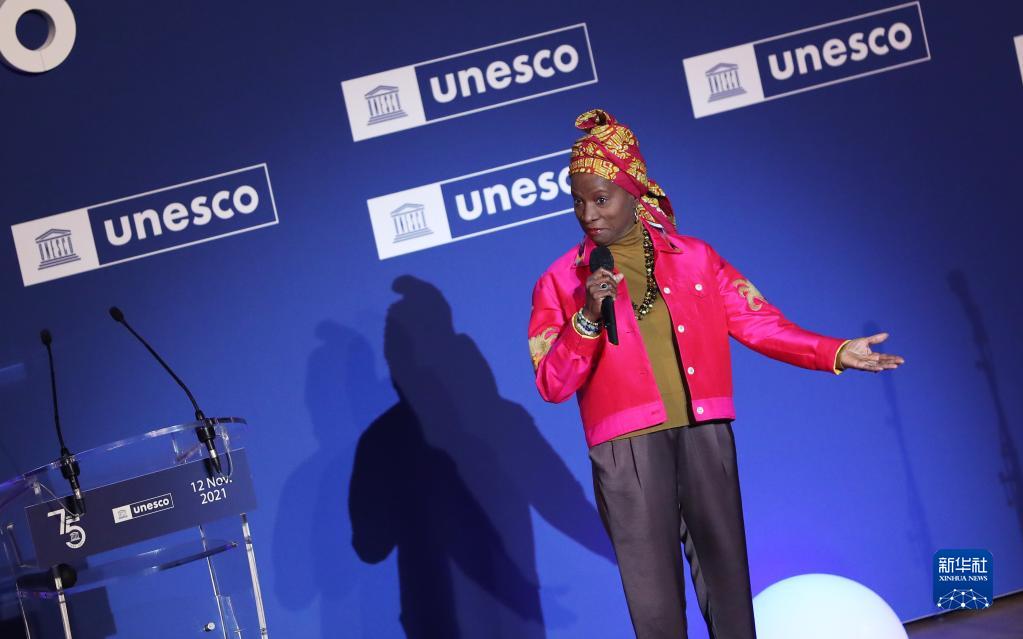 11月12日,歌手在法国巴黎的联合国教科文组织成立75周年庆典活动上演唱。新华社记者 高静 摄
