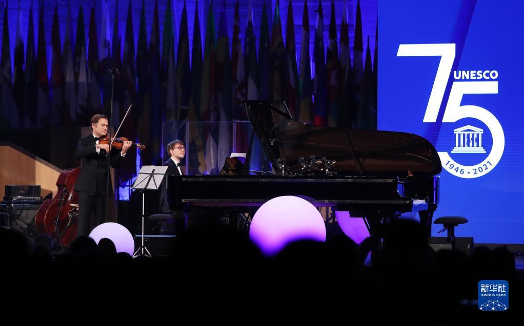 11月12日,音乐家在法国巴黎的联合国教科文组织成立75周年庆典活动上演奏。新华社记者 高静 摄