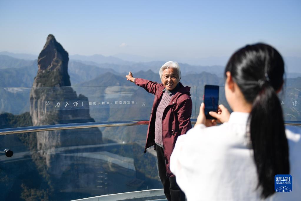 11月14日,一名老人在神仙居景区南天顶玻璃观景台留影。观景台位于海拔869米的悬崖峭壁之上,为单塔斜拉悬挑双层钢结构玻璃观景台,于2021年10月开放运营。 近年来,浙江省仙居县不断推进神仙居旅游度假区核心景区提质、区域环境综合整治、交通组织优化、村庄立面改造等工作,以持续丰富的旅游业态推进全域旅游示范区建设,大力发展美丽经济。 新华社记者 黄宗治 摄