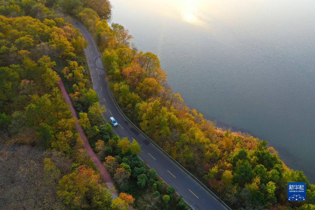 初冬时节,江苏省盱眙县天泉湖色彩斑斓,碧水与红杉相映成趣,构成一幅美丽的冬日生态画卷。