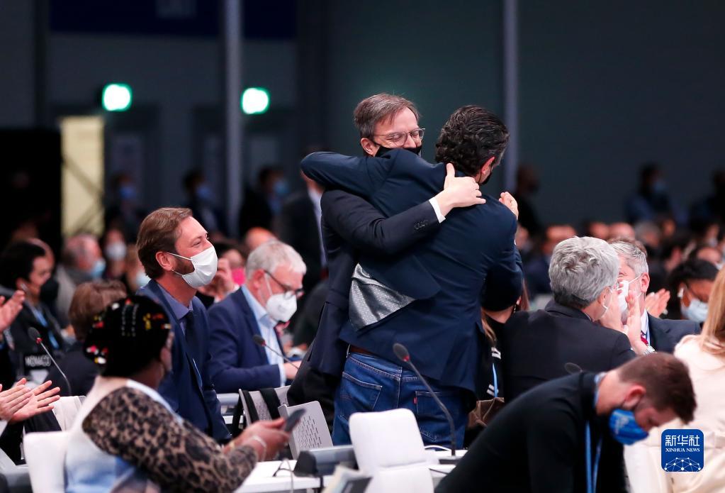 11月13日,与会代表在英国格拉斯哥举行的《联合国气候变化框架公约》第26次缔约方大会闭幕会上拥抱。