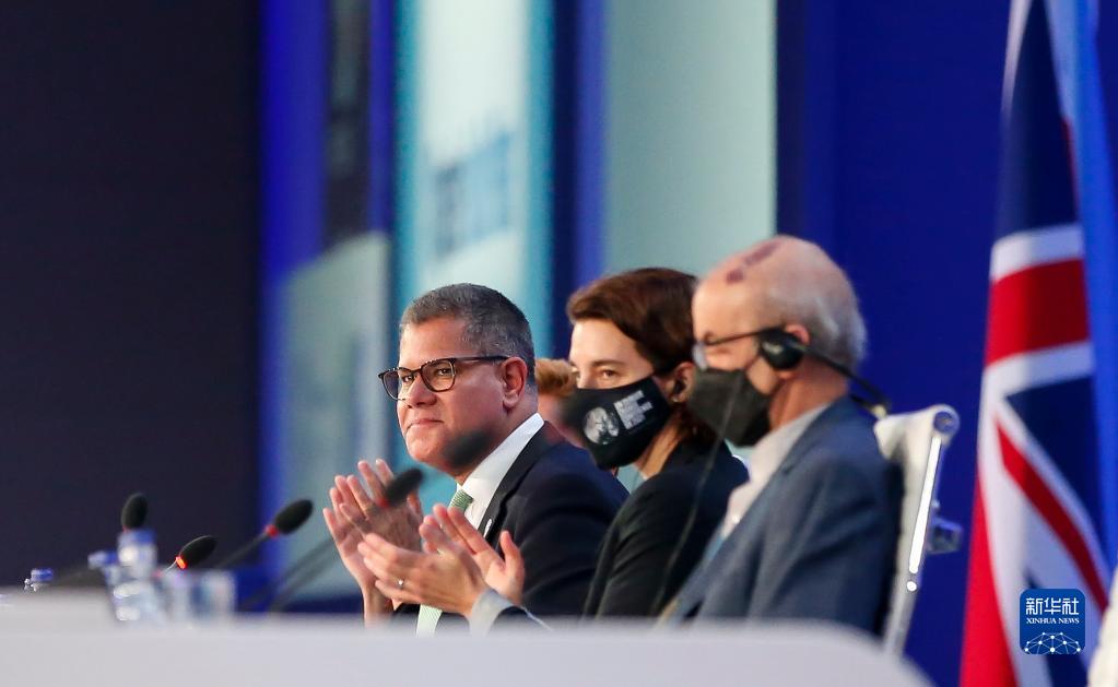 11月13日,《联合国气候变化框架公约》第26次缔约方大会主席夏尔马(左)出席在英国格拉斯哥举行的闭幕会。