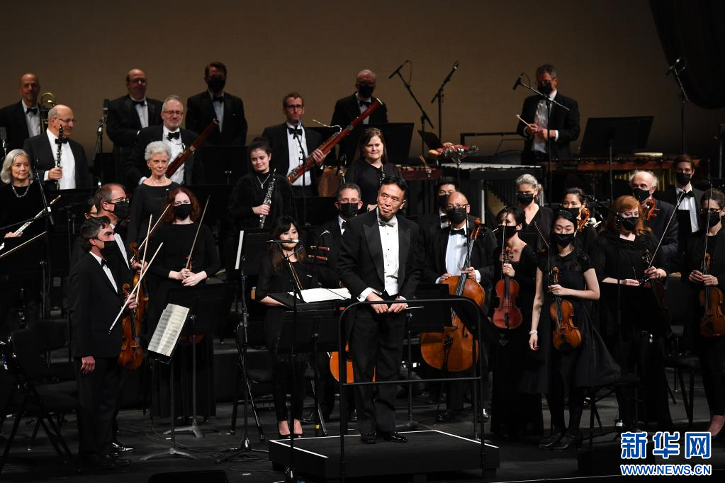 11月13日,在美国纽约林肯中心,指挥蔡金冬(前中)与纽约城市芭蕾舞团交响乐团成员向观众致意。新华社记者 李睿 摄