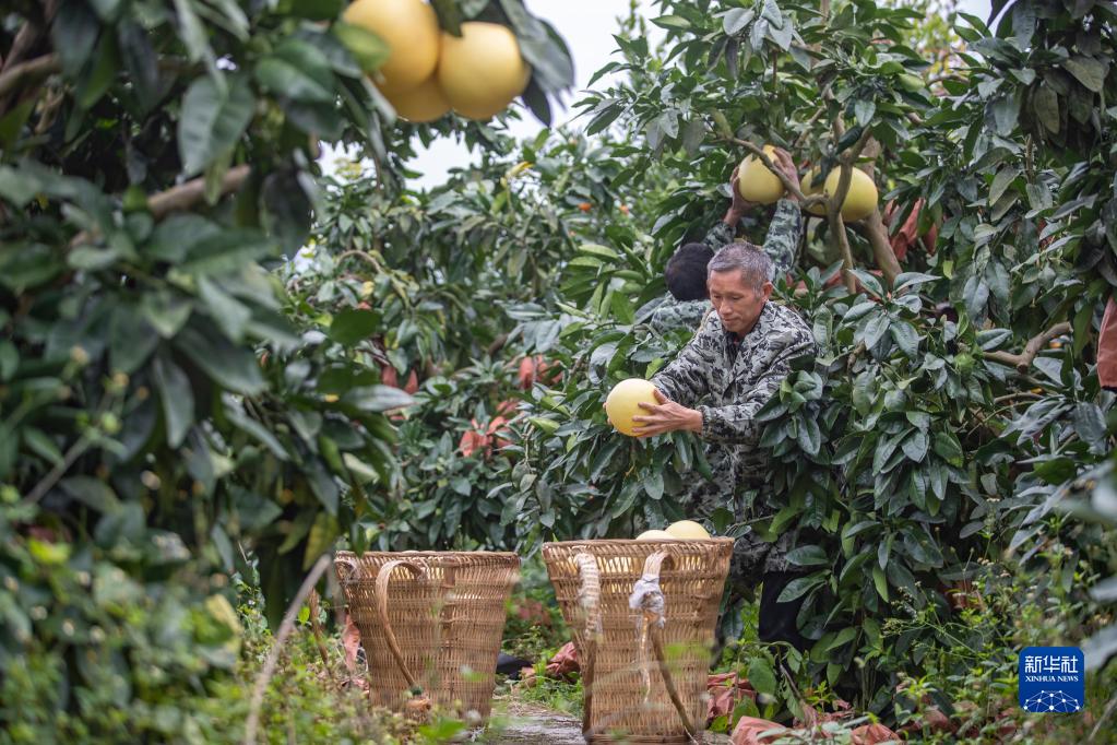11月15日,在巫溪县蒲连镇桐元村,村民王兴月(上)、王青翠在采摘蜜柚。 近日,重庆市巫溪县蒲连镇近8000亩蜜柚迎来丰收,当地村民抓紧采摘、打包蜜柚,供应市场。 新华社记者 黄伟 摄
