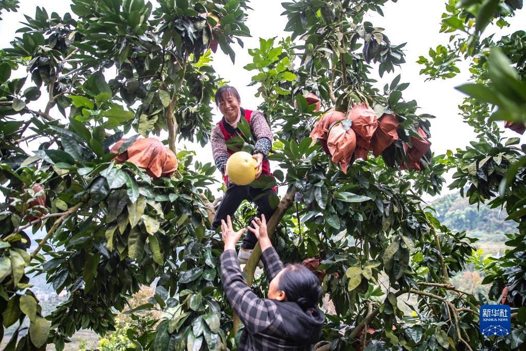 近日,重庆市巫溪县蒲连镇近8000亩蜜柚迎来丰收,当地村民抓紧采摘、打包蜜柚,供应市场。