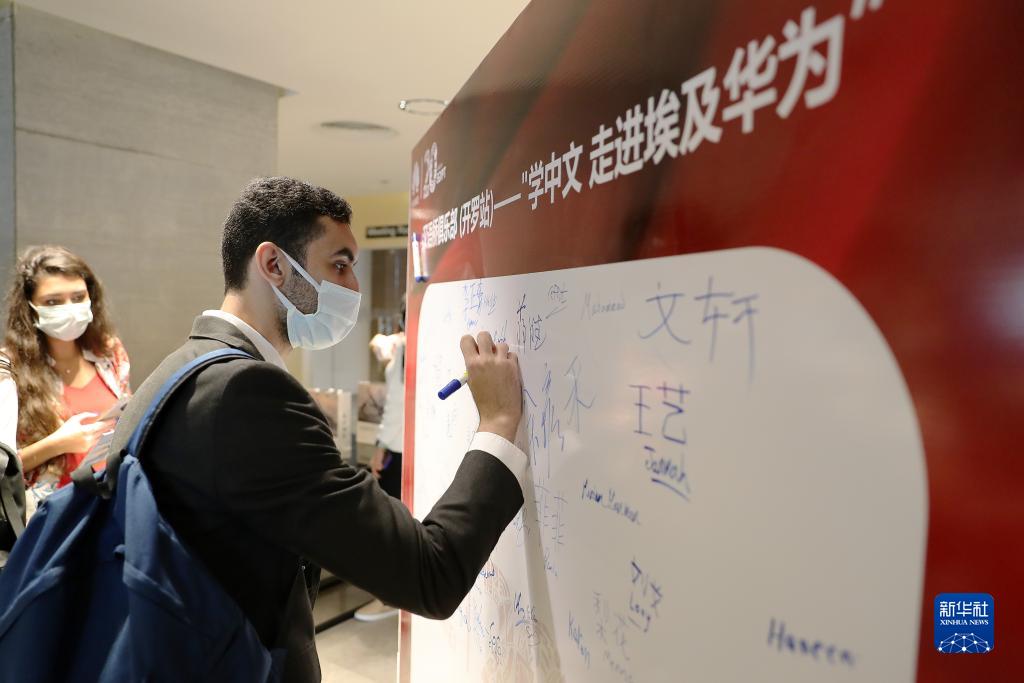 11月10日,在埃及开罗,学生代表在“学中文 走进埃及华为”活动签名墙上签名。 由“汉语桥”俱乐部开罗站主办的“学中文 走进中国企业”系列活动10日在埃及首都开罗启动。来自埃及中国大学、艾因夏姆斯大学等埃及高校中文系的60余名优秀学生代表走进系列活动第一站——华为埃及公司总部,了解中国企业,感受中企文化。 新华社记者 王东震 摄