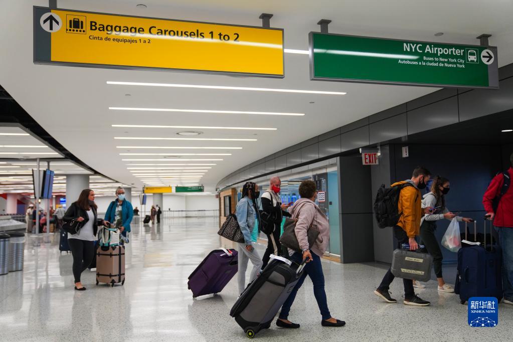 11月8日,在美国纽约肯尼迪国际机场,旅客领取行李后离开。 美国8日起放宽入境限制,允许完成新冠疫苗全程接种的外国旅客乘坐国际航班或通过水陆口岸入境。 新华社记者 王迎 摄