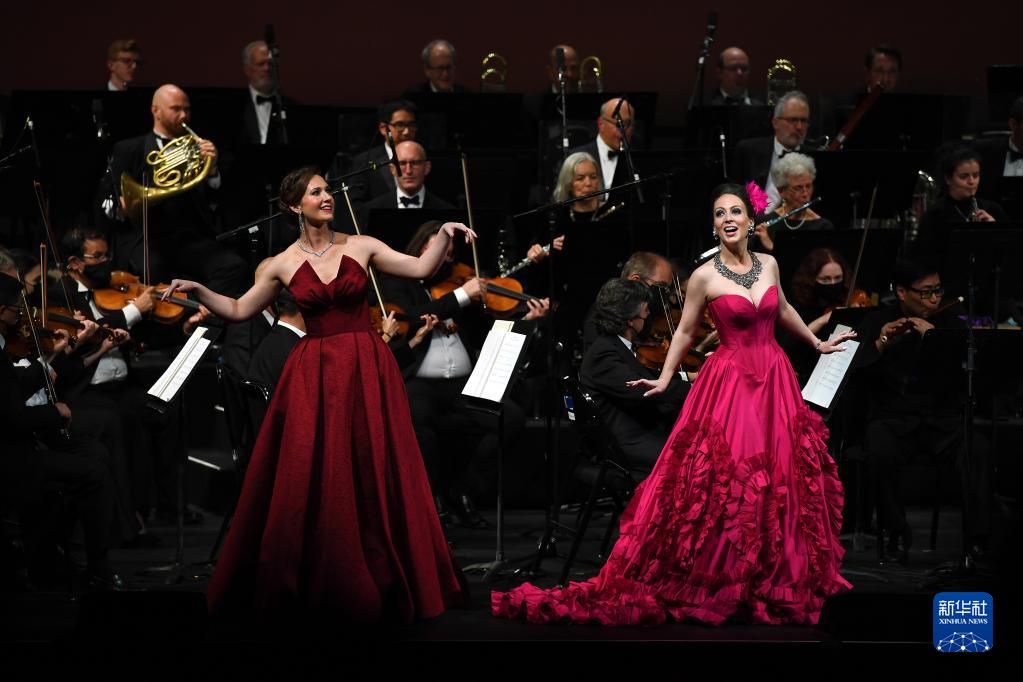 11月13日,在美国纽约林肯中心,女高音歌唱家埃丝特·莫琳·凯莉(前左)与花腔女高音歌唱家霍莉·弗莱克(前右)表演根据中国古诗词改编的歌曲《咏鹅·咏雪》。 “中华风韵”交响音乐会“东西之间”13日晚在美国纽约林肯中心奏响,为观众带来充满东方魅力的音乐盛宴。当晚,“中华风韵”携手纽约城市芭蕾舞团交响乐团、在美华人艺术家及美国本土艺术家推出“东西之间”,这也是新冠疫情发生以来“中华风韵”项目首次在北美举行的线下演出。 新华社记者 李睿 摄