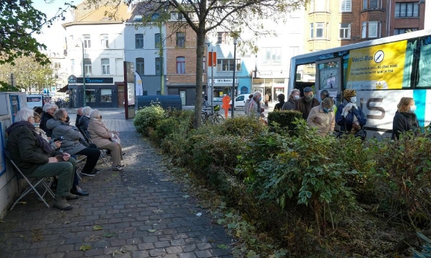 11月9日,人们在比利时布鲁塞尔一辆“疫苗巴士”前排队接种新冠疫苗。 比利时首都布鲁塞尔在多个社区部署了“疫苗巴士”,以方便人们接种新冠疫苗。据了解,一辆“疫苗巴士”配备4至5名工作人员。 新华社记者 张铖 摄