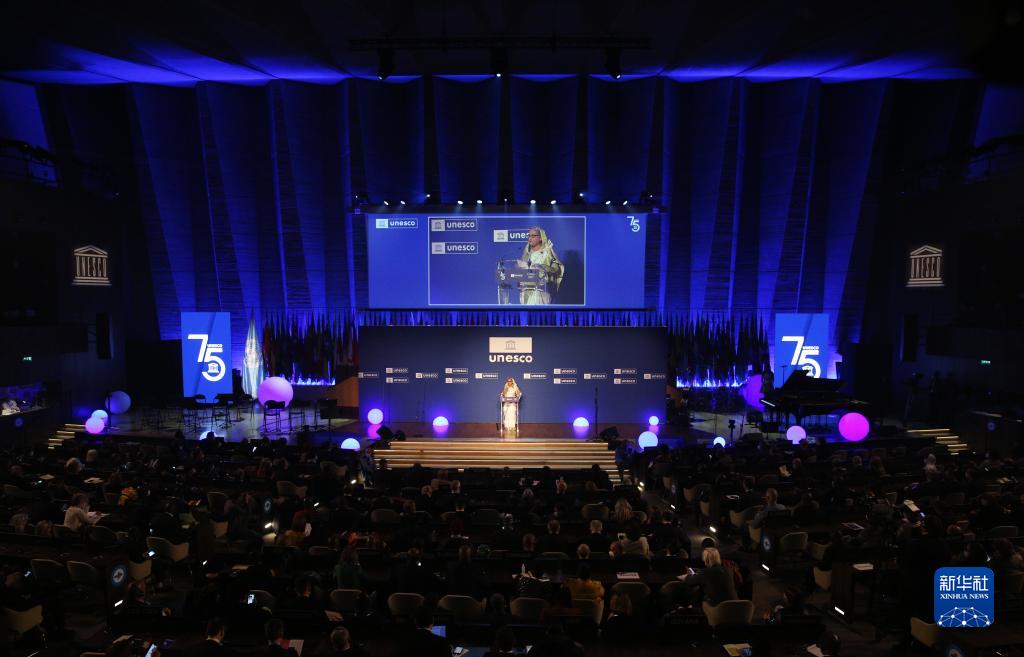 这是11月12日在法国巴黎拍摄的联合国教科文组织成立75周年庆典活动现场。 总部位于法国巴黎的联合国教科文组织12日举行活动,庆祝该组织成立75周年。联合国秘书长古特雷斯通过视频致辞表示,在全球面临巨大不平等、环境危机、两极分化和新冠疫情的时代,联合国教科文组织在重建信任和团结方面发挥的作用比以往更加关键。 新华社记者 高静 摄