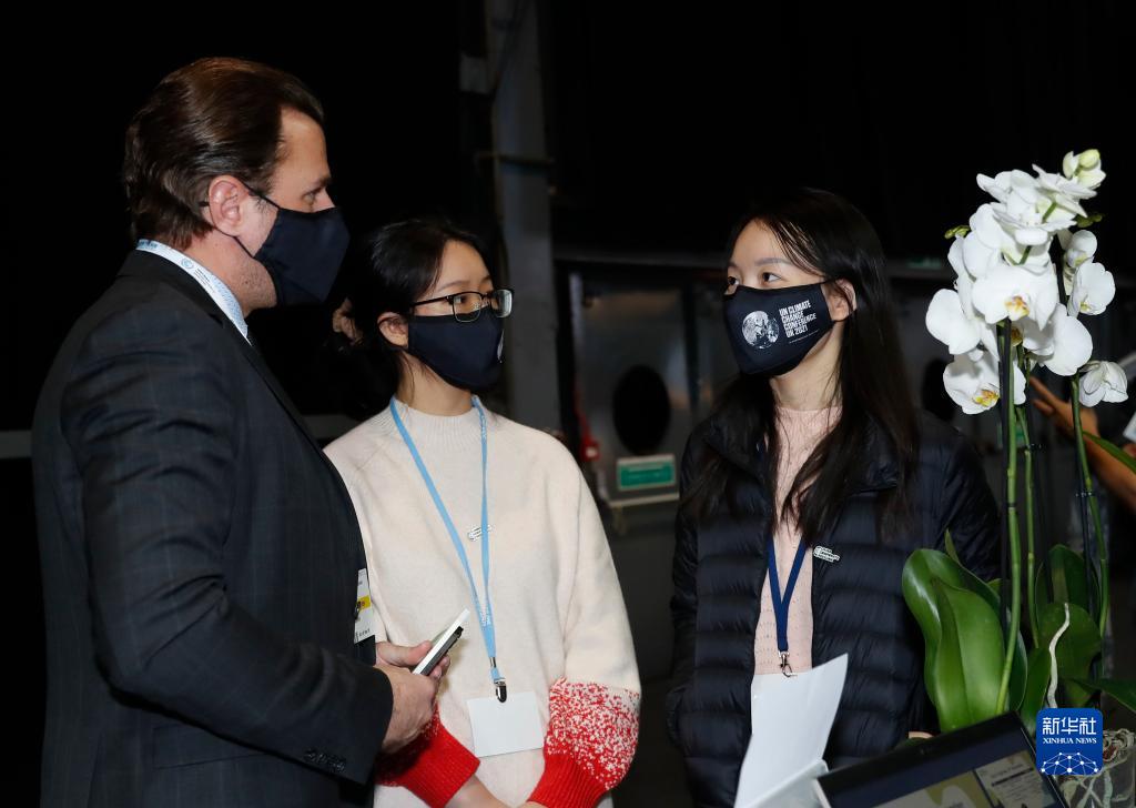 11月4日,在英国格拉斯哥联合国气候变化大会现场,志愿者柳珊(右)、张如苑(中)向参观者介绍中国企业馆。 联合国气候变化大会在英国格拉斯哥举行期间,几名来自“绿色光年”公益组织的中国留学生作为青年志愿者在大会中国企业馆服务。他们通过自己的志愿服务传播可持续发展理念,在世界舞台展示中国志愿者的风采。