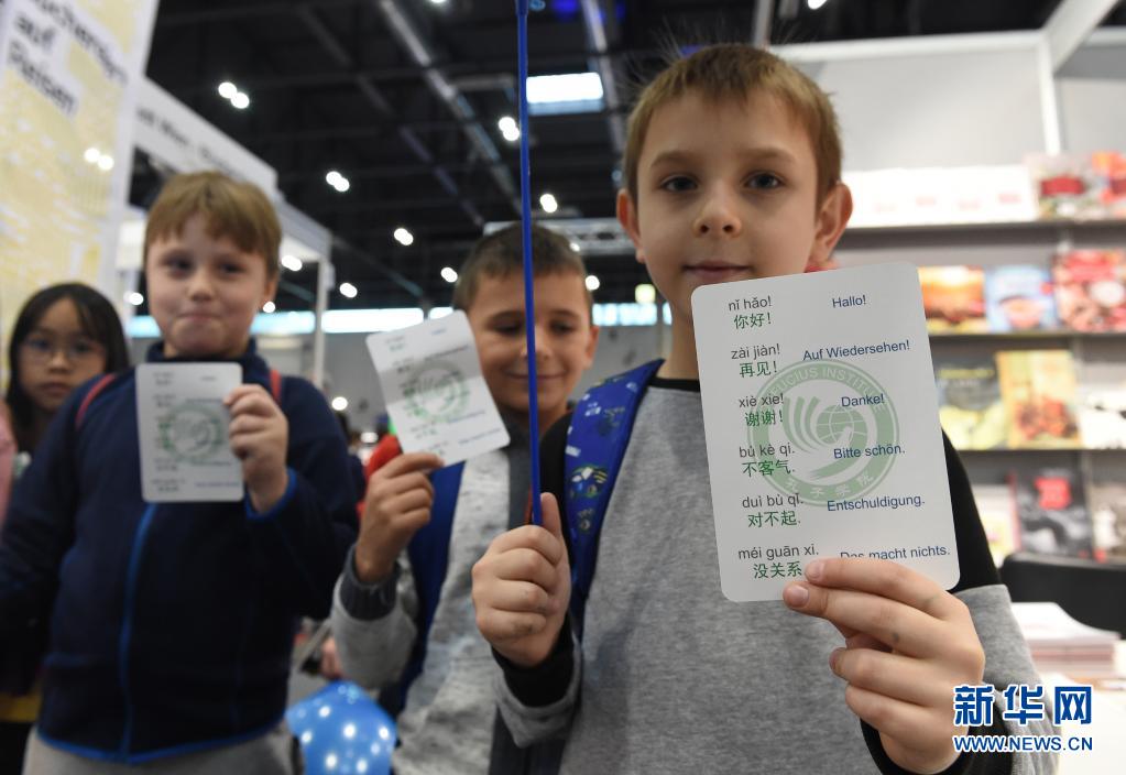 11月11日,孩子们在奥地利维也纳书展的维也纳大学孔子学院展台前展示学习汉语小卡片。 11月10日至14日,2021维也纳书展在奥地利维也纳展览中心举行。据介绍,本次书展有来自31个国家的323家参展商参展,并在展览期间举办多项活动和现场讲座。 新华社记者 郭晨 摄