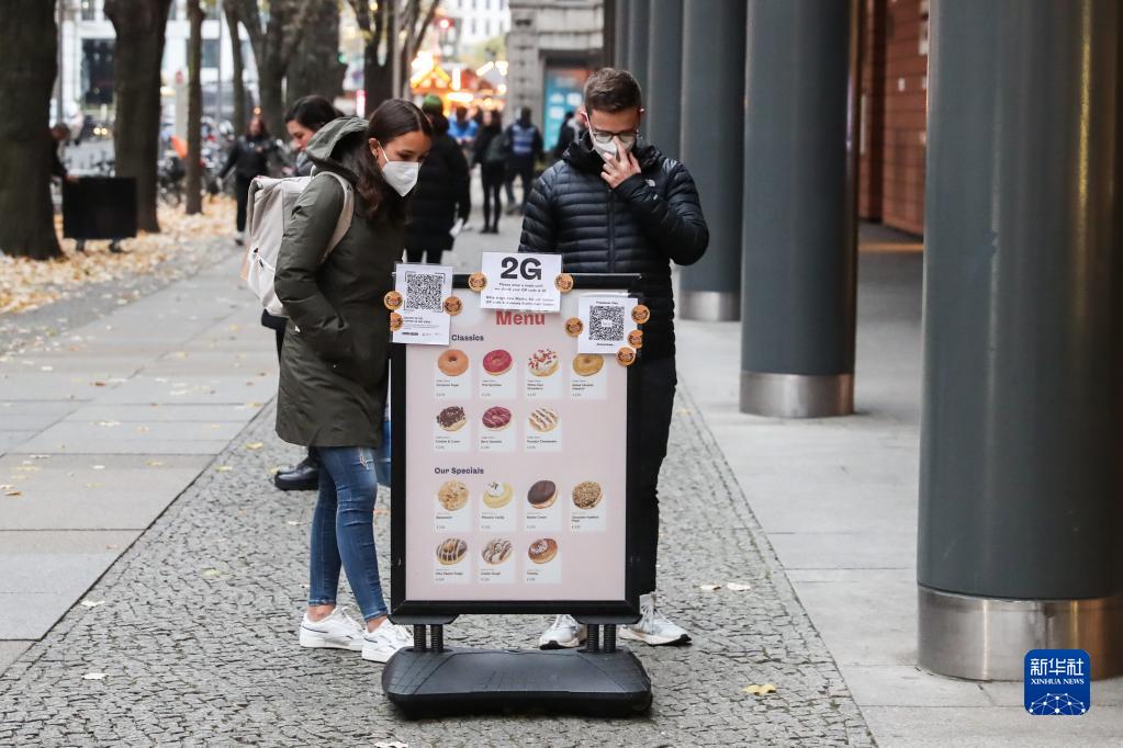 11月15日,在德国柏林,人们查看一家甜品店外贴有防疫须知的菜单展板。