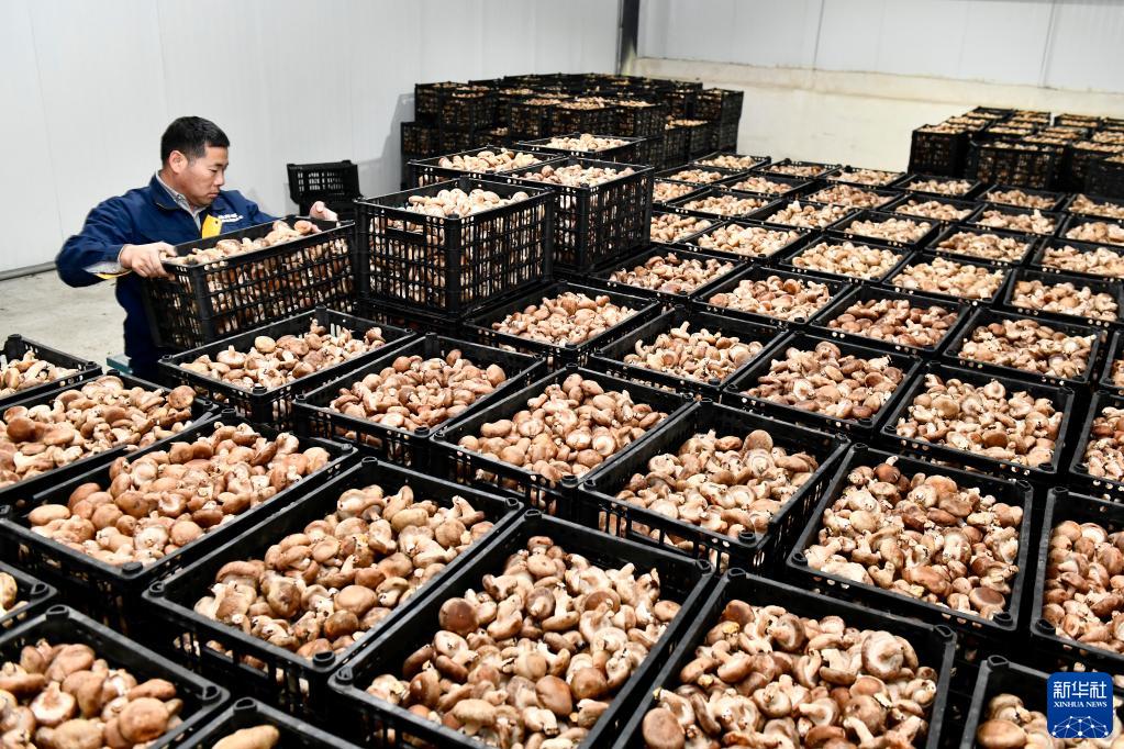 11月18日,在惠民县现代农业产业园食用菌示范园,农民在冷库里搬运香菇。新华社记者 郭绪雷 摄