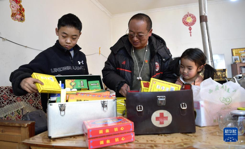 秋加(中)和他的孩子在整理药箱(1月14日摄)。