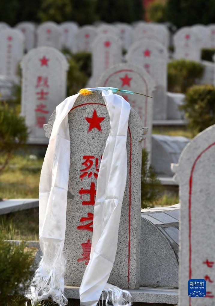 在西藏拉萨烈士陵园,一条洁白的哈达挂在烈士墓碑上(4月4日摄)。 新华社记者 觉果 摄