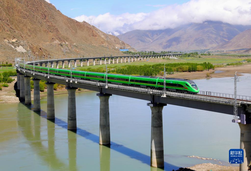 试运行的复兴号列车行驶在桑日县境内(6月8日摄)。 新华社记者 普布扎西 摄 |