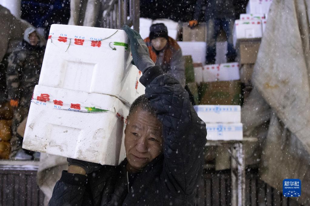 11月22日凌晨,在鸡西市一家大型蔬菜批发市场,工人们在搬运蔬菜。 黑龙江省鸡西市气象局于11月22日03时50分将暴雪橙色预警信号升级为暴雪红色预警信号。为保障当地物资运输畅通、居民出行便利,鸡西市相关部门迅速组织除雪力量,一夜无眠的“逆行者”在暴雪中用自己的辛苦付出,保障城市有序运转和居民正常生活。 新华社记者 张涛 摄