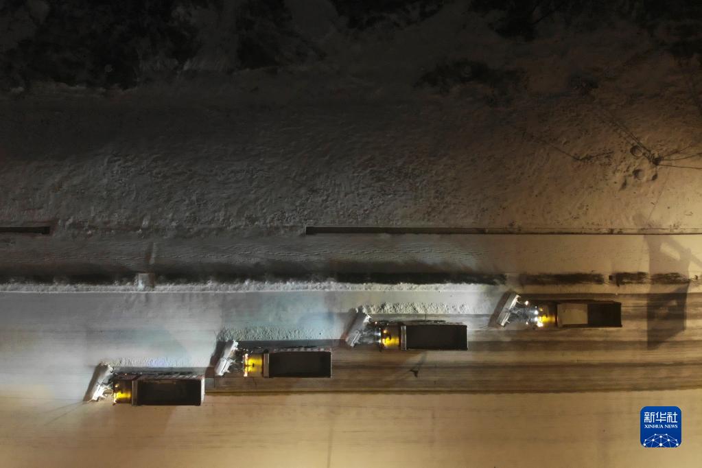 11月21日晚,环卫清雪车在鸡西市鸡冠区鸡东新路上进行清雪作业(无人机照片)。 黑龙江省鸡西市气象局于11月22日03时50分将暴雪橙色预警信号升级为暴雪红色预警信号。为保障当地物资运输畅通、居民出行便利,鸡西市相关部门迅速组织除雪力量,一夜无眠的“逆行者”在暴雪中用自己的辛苦付出,保障城市有序运转和居民正常生活。 新华社记者 张涛 摄