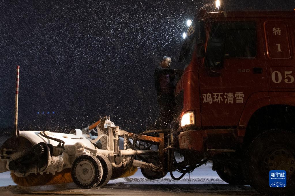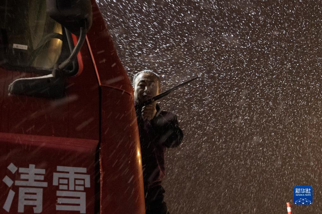 11月21日晚,清雪车司机在鸡西市鸡冠区鸡东新路上对车辆进行清理。 黑龙江省鸡西市气象局于11月22日03时50分将暴雪橙色预警信号升级为暴雪红色预警信号。为保障当地物资运输畅通、居民出行便利,鸡西市相关部门迅速组织除雪力量,一夜无眠的“逆行者”在暴雪中用自己的辛苦付出,保障城市有序运转和居民正常生活。 新华社记者 张涛 摄