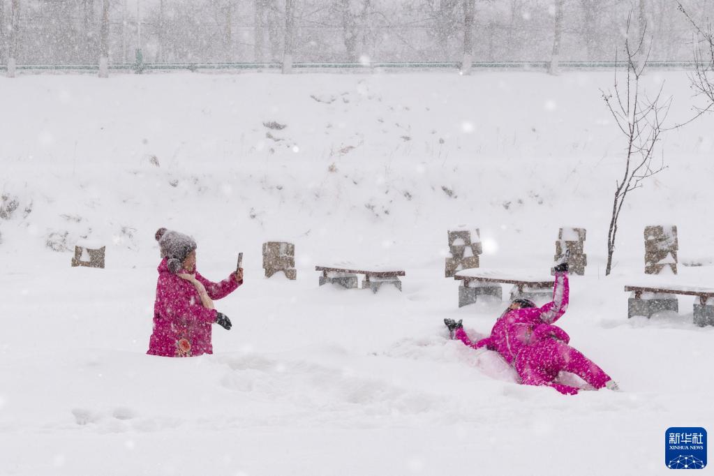11月22日,鹤岗市民在雪中玩耍拍照。