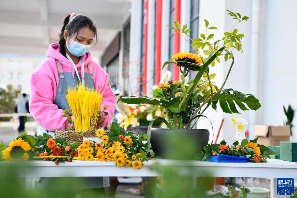 11月23日,参赛选手在贵州省龙里县中等职业学校参加艺术插花比赛。 当日,2021年贵州省黔南州中等职业学校师生技能大赛暨贵州省职业院校技能大赛选拔赛(龙里赛区)在龙里县中等职业学校举行。来自黔南州各职业学校的620余名参赛师生,分别就旅游服务、农林牧渔、加工制造、交通运输、文化艺术、财经商贸等类别进行现场实操比赛,展示职业教育的成果和风采。 新华社记者 杨文斌 摄