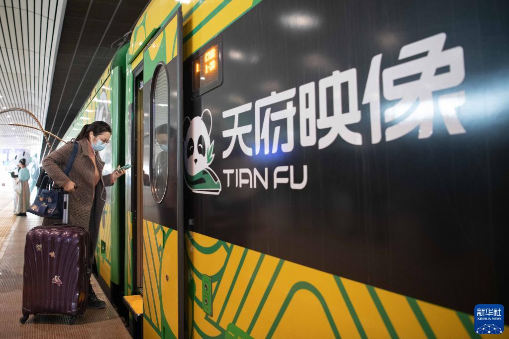 11月25日,乘客搭乘“天府映像”主题列车。 当日,全国首列巴蜀文化主题涂装复兴号动车组“天府映像”在四川成都上线。该主题列车以CR200J型复兴号动车组为车体,融入大熊猫、盖碗茶、川剧折扇、蜀竹、太阳神鸟等文化元素,展示巴蜀地域的文化特色和人文底蕴。 新华社记者 胥冰洁 摄 |