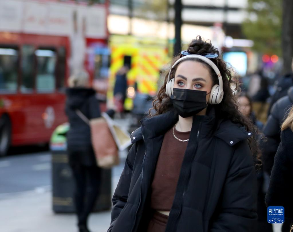 11月25日,一名女子在英国伦敦佩戴口罩出行。 英国政府25日公布的疫情数据显示,该国新增新冠确诊病例47240例,累计确诊10021497例;新增死亡147例,累计死亡144433例。 新华社记者 李颖 摄