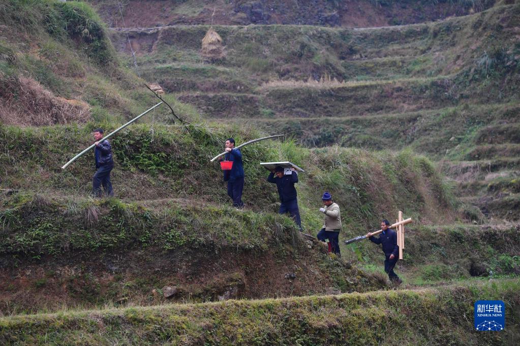 广西融水苗族自治县杆洞乡党鸠村村民准备安装太阳能路灯(2020年12月7日摄)。 近年来,广西柳州市融水苗族自治县在脱贫攻坚和乡村振兴中,积极推进“村屯光亮工程”,在广大农村地区竖起一盏盏太阳能路灯,将大苗山村村寨寨的夜色点亮,提升村民的获得感和幸福感。 新华社记者 黄孝邦 摄